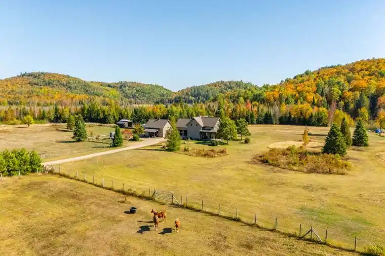 An extraordinary country estate set on 122 acres of rolling pasture, hardwood forest, and scenic trails. This timeless Discovery Dream Homes Timber Frame hybrid draws inspiration from classic farmhouse architecture and is finished with exceptional craftsmanship, reclaimed pine barn boards, slate tile, engineered alder and walnut floors, solid alder doors, and a dramatic 600 sq ft timber-framed great room with a stone fireplace. The 4-bedroom home is designed for comfort and connection, featuring a custom kitchen, handcrafted timber staircase, mahogany-accented upper level, and a screened-in timber porch. Step outside to the expansive outdoor entertaining terrace ideal for al fresco dining, evening gatherings, and taking in the sweeping countryside views. Equestrian-ready with 25+ acres of fenced pasture, horse paddocks, a 24×36 barn with two 10×20 stalls (with power and water), and a hay barn with covered storage. A 2-car garage is attached to the home, and a separate garage includes a workshop and office space perfect for creative pursuits or home-based business. A private trail network winds through managed forest, leading to a charming wildlife viewing cabin overlooking Grace Lake and adjoining crown land. With in-floor radiant and gas heating, an Amberwood front door, and inclusion in the Managed Forest Program, this property offers the ultimate in luxury, privacy, and rural sophistication.