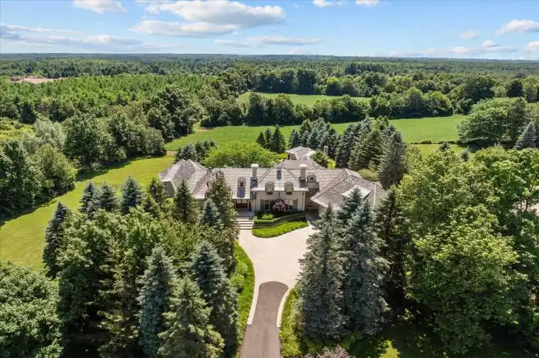 STONEGATE MANOR – AN ARCHITECTURAL MASTERPIECE! Nestled on 2.5 acres of manicured grounds behind private gates in prestigious Whispering Pines Estates, Stonegate Manor is a palatial estate crafted by an award-winning builder. A picturesque pond with fountain greets you at the foot of the driveway, setting the tone for timeless French Manor-inspired elegance. A grand foyer with 17.5-foot cathedral ceiling and hand-painted mural opens to a living room with 18-foot vaulted ceiling, two-storey cherrywood gas fireplace and expansive windows flooding the space with natural light. The chefs kitchen features a 48″ Wolf gas range, Sub-Zero fridge, Miele dishwasher, servery, and three sets of French doors opening to a private courtyard. The formal dining room connects to a wine cellar with antique Asian doors, while a private office with 15-foot vaulted ceiling, gas fireplace and built-ins offers a refined workspace. The luxurious primary suite boasts a 14-foot vaulted ceiling, courtyard walkout, gas fireplace, walk-in closet, gym, and spa-inspired 7-piece ensuite with clawfoot tub and steam shower with built-in chaise. A lofted entertainment area features a 14-foot vaulted ceiling, wet bar, pool table, theatre setup, and powder room. The finished lower level includes heated floors, full kitchen, 3 bedrooms, 2 baths, and walkout to a private patio – ideal for multi-generational living. Resort-style amenities include an inground saltwater pool with integrated hot tub, standalone hot tub, koi pond, and an additional pond with fountain. The cabana features a wood-burning fireplace, kitchen, seating, automatic mosquito screens, 2-piece powder room, and change room. Additional highlights: elevator to all levels, Crestron Home Automation, oversized 3-car garage, and new concrete/asphalt driveway. A rare offering of elegance and lifestyle – just minutes north of Campbellville!