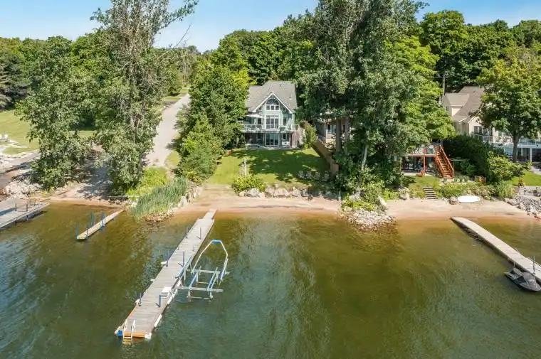 Top 5 Reasons You Will Love This Home: 1) True gem located on a peninsula of the sheltered lee shore of Midland Bay, enjoying 260-degree of ever-changing panorama of the lake and sky, this custom-built waterfront property boasts its own dock, boat lift, private sandy beach, and three integral garages 2) Recently painted with newly installed engineered hardwood flooring on both upper and lower levels, this home’s central charm lies in its vaulted ceilings and open-concept design, along with the kitchen, living room featuring a gas fireplace, and dining room flowing together seamlessly, creating a warm and inviting space that extends onto a wraparound deck 3) The Primary bedroom with a walk-in closet, an oversized ensuite complete with a spa bath, and huge windows that frame the spectacular views, alongside two additional bedrooms, a laundry room, a full bathroom with a separate toilet and built-in cabinetry complete the upper level 4) The fully finished walkout basement presenting two large rooms perfect for guest accommodation, a 3-piece bathroom, and a cold storage room, in addition to a large family room complete with a gas fireplace and leading onto a bricked patio area and a covered screened-in porch creates flexible living for the whole family 5) The professionally landscaped garden with mature trees, natural stone, grass, and a variety of shrubs along with being situated at the end of a quiet road, creates a distinct advantage of minimal traffic, ensuring peace and tranquillity year round. 3,550 fin.sq.ft. Age 26.