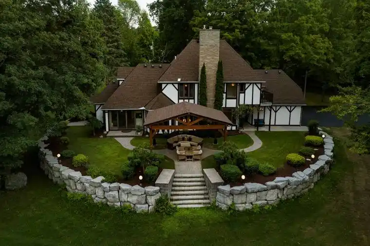 Exquisite English Tudor Estate 3.785 Acres of Panoramic Beauty in Rural Tay Township. Custom-built architectural gem on a private cul-de-sac, surrounded by nature. Offering a sense of seclusion & grandeur that is truly a one-of-a-kind. Designed for comfort & elegance, the home features dual-zone propane forced-air furnaces, upgraded insulation, & near floor-to-ceiling windows that frame year-round views of the park like setting.Gourmet kitchen is a chefs dream with granite counters, JennAir built-in double ovens, JennAir stovetop island, stainless appliances & a spacious 2nd large island connecting seamlessly to the dining & sitting rooms. Luxury double doors lead to an expansive terrace with 2 bbq hookups & a custom 15′ x 21′ pavilion overlooking manicured grounds.The back property, an incredible blank canvas for your ultimate outdoor oasis. Whether you dream of a pool, cabana, outdoor kitchen, or another entertainment feature, bring your vision to life here.Inviting living room offers a stone propane fireplace & walkout to both the breezeway & terrace. The elegant spiral staircase leads to 4 upper level bedrooms, incl the primary suite with walk-in closet, spa inspired ensuite with oversized jet soaker tub, heated floor & Juliet balcony. The main floor offers a versatile 5th bedroom, originally used as an office, plus a well-appointed laundry room with abundant storage.Finished lower level features a theatre room, exercise space & display of art with endless possibilities to customize to your needs. Highlights incl. a heated dble garage & a location where the school bus drives along the st.Enjoy an easy commute via nearby Hwy 400 & a central location 30 min to Barrie & Orillia & 15 min to Midland. Go snowmobiling from your front door. An exceptional blend of timeless craftsmanship, modern luxury, ideal for the discerning buyer seeking both sophistication & a perfect setting to raise a family & entertaining guests. Don’t miss out!