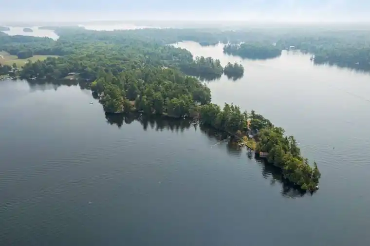 Heavenly two acre peninsula on Opinicon Lake that’s intricate part of Rideau Canal system for great swimming, boating & fishing. The peninsula feels like a sanctuary with the lake on three sides and Mother Nature in-between. Panoramic 360 views include sunrises, sunsets and, magical calls of the loons. In the midst of this beauty, beloved cottage all tastefully and thoughtful renovated into welcoming summer home. You also have boathouse and elaborate hi-end docking system with lights. The peninsula has 1,381′ waterfront; one side crystal clear for swimming. Other side natural flora where birds and frogs thrive. On huge rock at the shore, amazing pergola-gazebo with landscaped waterfall and hammock structure – ideal for watching lake flow by during the day and stars sparkle in the evening. With pleasing style, the summer home features contemporary layout and modern comforts. Adding character are vaulted log & pine ceilings and magnificent century granite floor-to-ceiling fireplace with log mantle. Dining room bay window has bench seat offering mesmerizing lake views. Upscale quartz kitchen of display cabinets and quality 2020 Samsung appliances. Well-designed sunroom-porch overlooks the great outdoors. Main floor, spacious primary bedroom with wood accents and windows on three walls for never-ending views. Three-piece bathroom glass & ceramic shower. Second floor familyroom basks in sunlight from skylights. This room also has vaulted pine ceiling and the fireplace’s showcase upper stone wall. Second floor bedroom also has vaulted ceiling and skylights; 3-pc bathroom spa-body shower. Expansive deck provides resort-like luxury, 2024 Jacuzzi hot tub & 2024 cold plunge. All furnishings included. Propane furnace & central air. For guests, new 2024 bunkie tucked up on hill with wrap-about deck, vaulted ceiling, laminate floor, electric fireplace & AC unit. Hi-speed. Cell service. Private road maintenance fee $100/yr. 10 mins Elgin for groceries. 45 mins Kingston or Perth.