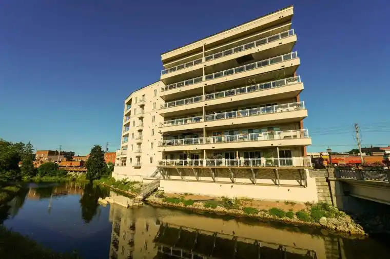 An exceptional residence in the heart of Owen Sound, this second-floor condominium is at once refined and comfortable. A private elevator opens directly into the home, setting a tone of distinction. The open-concept living, dining, and kitchen area is defined by hardwood floors, a soft, sophisticated palette, and crisp white trim. The kitchen is appointed with built-in appliances and quartz countertops, while the living room, with its gas fireplace framed by floor-to-ceiling bookshelves, extends to a broad balcony overlooking the Sydenham River.The primary suite features balcony access, a generous walk-in closet, and a private four-piece ensuite. At the opposite end of the home, the second bedroom, complete with its own walk-in closet and adjacent full bath, offers privacy for family or guests.The balcony spans the length of the residence, with room for dining, lounging, and entertaining while taking in uninterrupted river views. A second, smaller balcony off the dining area provides another unique vantage point. Residents also enjoy a kayak dock and storage, secure entry, and underground parking with an exclusive parking space (with EV hookup capability) and large storage locker.This preferred condominium building offers a highly walkable lifestyle, steps from the theatre, library, and the shops and restaurants of downtown Owen Sound. An elegant urban retreat with riverfront vistas.
