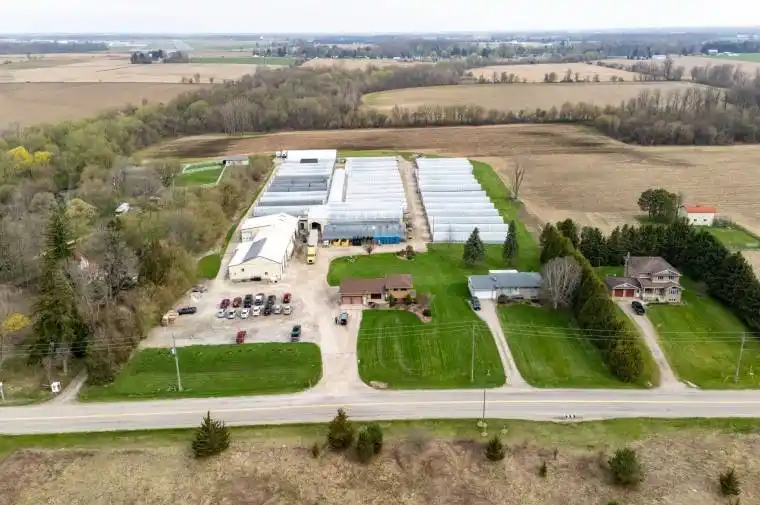 Just shy of 10 acres, this remarkable property features a 7,700 sq. ft. commercial-grade shop, a spacious five-bedroom home, and nearly 84,000 sq. ft. of greenhouse space is located just outside London, Ontario in Thames Centre. The 48 greenhouses, each accessible via grade-level doors, are supported by two deep wells and a manual irrigation system, enabling efficient, year-round production. The insulated shop is equipped with multiple grade-level doors, a walk-in cooler, and office space. The shop includes five 12×12 doors, one 12×10 door, and one 8×8 door, as well as an additional 12×12 door near the greenhouses, offering flexible access for equipment and product staging. The residence offers five bedrooms, two bathrooms, an open-concept main floor, and an attached two-car garage perfect for family living or on-site staff housing. Owned solar panels under a 20-year Hydro One contract (with 10 years remaining) provide additional annual income. The rear of the property includes 4 acres of workable farmland currently planted with corn, offering room for future expansion or diversified agri-use. With excellent road frontage, a generous parking lot ideal for retail development, and quick access to Veterans Memorial Parkway and London city limits. The current business can be sold separately which wholesales a wide range of plants from petunias and perennials to hanging baskets and vegetable starters serving businesses, weddings, homes, and gardens across the region.