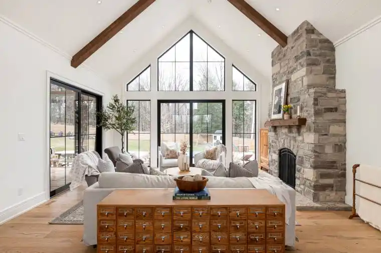 This exceptional high-end bungalow blends the charm of a European villa with modern luxury. Set well back from the road and approached by a circular driveway, the home boasts a striking exterior with wood siding, vertical board and batten, painted brick accents, and arched doorways. Inside, the kitchen is a masterclass in design, featuring an oversized island with a prep sink, panel-front appliances, and a stunning Elise propane range with pot filler. A walk-in pantry offers seamless storage. Vaulted ceilings in the kitchen and living room enhance the sense of space, while a propane stone fireplace anchors the open-concept design. A full wall of windows opens to an exquisite outdoor living area: a custom hexagonal stone patio surrounding a beautiful pool and mostly level, fully fenced backyard. The screened Muskoka Room with a wood-burning fireplace provides an inviting retreat, while the adjacent dining room is ideal for entertaining. The private bedroom wing includes two spacious guest bedrooms sharing a 5-piece Jack and Jill bathroom, and the rear-positioned primary suite offers serene backyard views. Its spa-like ensuite features a freestanding tub, glass-enclosed shower, and double vanity, while the walk-in dressing room provides ample storage. The opposite wing includes a large laundry room with folding surface, drying rack, and stylish laundry sink, as well as a mudroom with built-in storage and access to the heated double garage, currently a workshop but easily converted. The lower level offers a generous rec room, two additional bedrooms, and a 3-piece bathroom. A whimsical playhouse under the stairs adds charm, while a spacious storage room and tidy utility area complete the space. A rare find crafted with impeccable design, this home is a perfect blend of style and functionality.