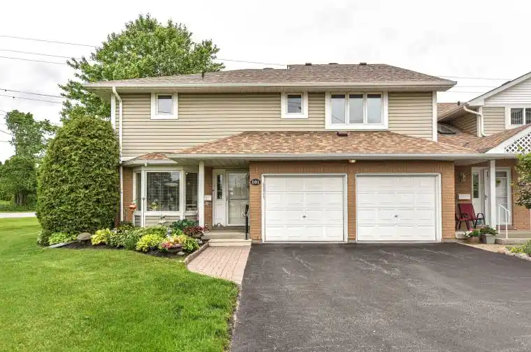 Incredible value at Leacock Village. recently repainted throughout main and upper floors! location is one of the best in the development backing onto greenspace with no condos behind you. one of only two units with a two car garage. the main floor Living/Dining has hardwood floors, the two primary bedrooms have walk in closets and ensuite baths. enjoy the extra light this end unit provides with the additional windows and a second walkout. All floors done in hardwood or laminates with the only carpet on the stairs. Condo fees include shoveling snow to the door, exterior maintenance, Phone/internet/TV (some photos virtually staged)