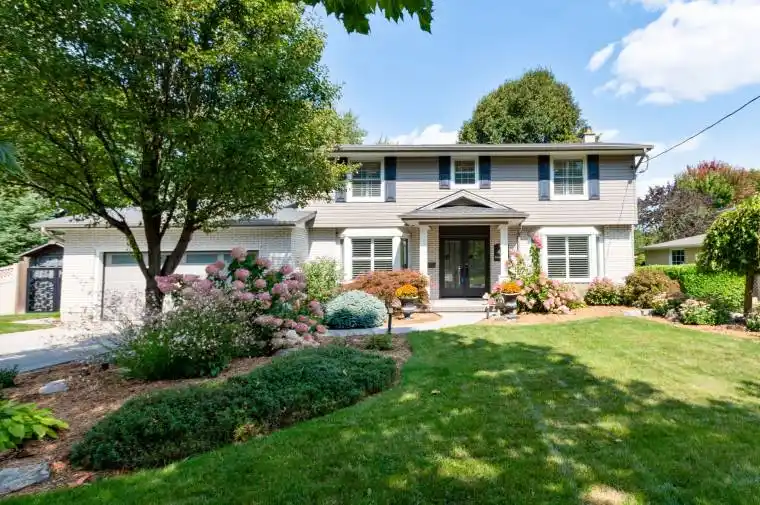 Set well back off the street on an oversized 80 x 140 foot treed lot in north London’s highly sought after Masonville neighbourhood is this lovingly cared for and tastefully updated family home, a short sidewalk stroll from Masonville Public School, one of the regions top ranked schools. This homes family friendly layout has been modernized with an open concept kitchen, dining and family room and includes a wall of windows to the stunning private back yard with two tiered concrete patios and pool. New custom designed kitchen (16), with gorgeous Quartz counters, sprawls with plenty of storage and counter space and includes a two-seat peninsula, separate wet bar with beverage fridge, full size stainless-steel fridge & freezer and a built-in corner bench dinette seating overlooking a composite rear deck, ideal for BBQing. The spacious family room has soaring vaulted ceiling and cozy gas fireplace with brick surround. Main floor study with French doors includes custom double desk and built-in shelves. Hardwood floors are throughout the main and second floors with slate floor foyer and tiled bathrooms floors. Upstairs there are four good sized bedrooms. The primary suite is complete with walk-in closet and updated ensuite bathroom with glass shower. Finished lower level includes insulated dry-core flooring in the rec-room, games room and laundry room. An additional 2pc bathroom in the lower level is next to a separate door & staircase to the backyard patio for convenient access from the pool. Additional upgrades include new windows (01) and vinyl siding, roof and additional insulation in 2020. This incredible location is only a 10-minute walk to Masonville Place, 18 minutes to University Hospital, 21 minutes to Western University and only 5 minutes to Helen Mott Shaw Park. With concrete driveway, walkways, patios and extensive landscaping this home truly has it all. Book your viewing today.