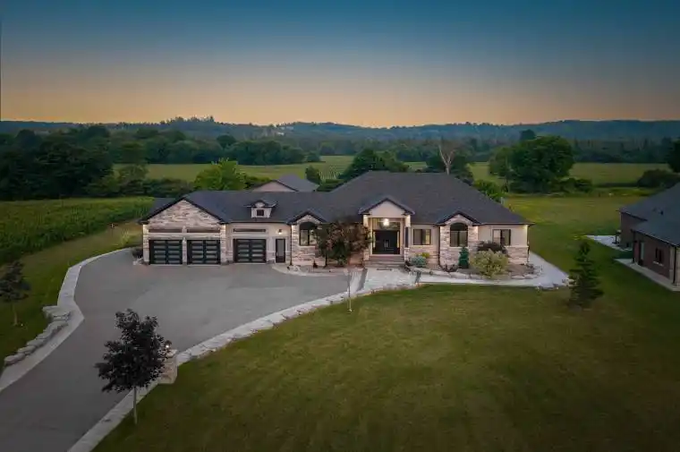 Welcome to 9383 Wellington 124 Road in Erin, an absolutely stunning custom-built bungalow offering over 5,700 square feet of finished living space. Set on 1.31 acres of beautifully landscaped grounds, this home is designed with exceptional craftsmanship and thoughtful details throughout.The main level spans 2,846 square feet and features an open-concept layout with soaring 10- to 15-foot ceilings. A striking 9-by-15-foot picture window floods the family room with natural light, while the gas fireplace adds warmth and elegance. The gourmet kitchen is a showpiece, complete with a centre island, leathered granite counters, stainless steel appliances, and upper and lower accent lighting. The primary suite is a true retreat with a lavish spa-like ensuite, while the additional bedrooms offer spacious layouts, walk-in closets, and a Jack-and-Jill bath.The fully finished lower level adds another 2,876 square feet of living space, featuring a massive recreation room, guest suite, and full bath. This versatile space is perfect for entertaining, relaxing, or hosting extended family and friends.Outdoors, the property continues to impress with a heated saltwater pool, cascading waterfalls, a sports pad, and a cabana that can also serve as a separate garage with space for up to four additional vehicles. Along with the oversized three-car garage with a drive-thru bay and the long private driveway, this home offers exceptional parking and functionality.This is more than a home its a lifestyle. Combining luxury, recreation, and comfort, 9383 Wellington 124 Road delivers the best of both home and cottage living in one remarkable property.