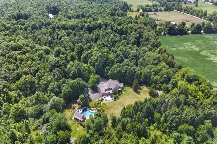 A Signature Estate in Nassagaweya. Set at the end of a long, tree-lined drive, this remarkable custom-built 4-bedroom, 7-bathroom residence delivers over 6,100 sq. ft. above grade plus approx 2,000 sq. ft. finished walk-out lower level. The grand two-storey foyer leads to a striking great room with floor-to-ceiling stone fireplace, a light-filled conservatory, private office, and a sunken living room. The chefs kitchen showcases premium appliances, live-edge granite surfaces, an oversized island, and a sunny breakfast nook, while the formal dining room offers a two-sided stone fireplace and custom cabinetry. A billiards lounge with lava rock bar, waffle ceiling, and bespoke built-ins adds to the main floors appeal. Upstairs, the primary suite features a spa-like ensuite and a custom walk-in closet, while three additional bedrooms each have their own designer baths. A secondary staircase provides direct access to the kitchen and laundry. The lower level is fully finished with a large recreation area, games room, and 2-piece bath. Outdoors, the resort-style grounds feature a lagoon-inspired saltwater pool with waterfall, wading area, swim-up bar, and custom hot tub. A cedar pool house with 2- piece bath, sunken outdoor kitchen, and stone patio BBQ space make entertaining effortless. The property also includes two fire pits, a playhouse, horseshoe pit, vast lawn areas, a detached garage with heated workshop, and parking for 50+ vehicles. All within minutes of Rockwood, and an easy commute to Guelph, Milton, the GTA, and Pearson Airport. A home that delivers unmatched luxury, privacy, and lifestyle.
