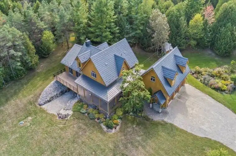 Luxury Country Retreat Nestled on a Peaceful, Private & Lovingly Landscaped 9.8-Acre Property. As you approach the magnificent log home, which commands attention, you’ll be drawn to the front steps leading up to the welcoming composite porch, inviting you to explore the interior. As you step through the front door, you’ll be greeted by a bright, spacious, and immaculate interior. The main floor showcases an impressive kitchen with an oversized island & a complete appliance package, dining area with access to expansive deck, a grand great room with soaring cathedral ceilings, & a stunning wood burning fireplace that makes a bold statement complete with a dumb waiter for added convenience. The tranquil primary bedroom features a five-piece ensuite and a walk-in closet that meets your every need. Another full bathroom, a large laundry room, & a practical mudroom completes the main level. As you ascend the log stairs to the second level, you’ll appreciate the open office space overlooking the main floor and discover two generous bedrooms sharing another well-appointed bathroom. The walkout basement presents endless possibilities – ample space for a workshop, storage, separate panel for generator, or your own custom finishing touches. There’s also a substantial cold room with walk up access to the triple car garage, plus a fully finished loft above the garage with custom finishing touches that any guest would absolutely love and may never want to leave. After you’ve explored the spectacular interior, step outside to find an older home used for storage, along with a large storage shed & a garden shed, surrounded by many perennial flower beds. This property offers not just a home, but a serene lifestyle in a beautiful setting on a quiet country road within minutes to Allan Park Conservation Area where you can enjoy fishing, cycling, snowshoeing, skiing & hiking trails, and tobogganing. Are you ready to confidently claim this extraordinary home and property as your own?