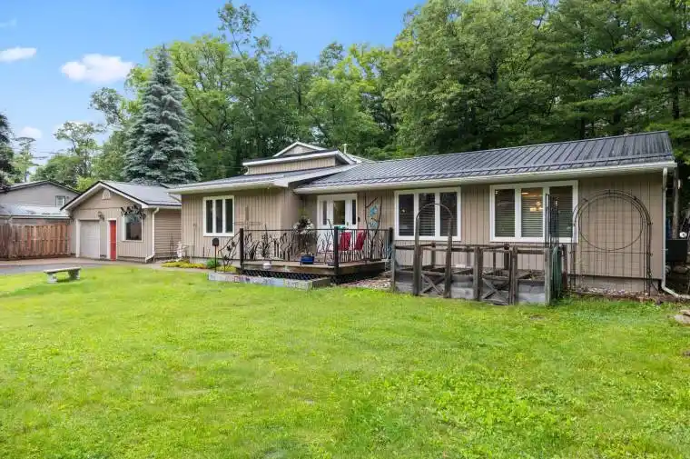 Unique Residential & Commercial Opportunity in desirable Port Franks! Welcome to this beautifully maintained and updated bungalow nestled in the charming lakeside community of Port Franks. Situated on a quiet treed lot, this property offers incredible potential for homeowners, investors, business owners or a combination to suit any buyer. The spacious main home features a bright and airy open-concept layout boasting a large kitchen loaded with storage, stainless steel appliances and wrap around island with two-tier breakfast bar; 2 bedrooms and 2 full bathrooms including primary suite with walk in closet and spa-like ensuite; living room with laminate flooring; dinette with direct access to the backyard; main floor laundry; and office space with built-in shelving. Enjoy your morning coffee and the sounds of nature in the private treed backyard or on the generous front deck. A large detached garage/workshop has 200amp service, 2-piece bathroom, and sink with counter and shelving providing ample space for hobbies, storage, parking or entrepreneurial use. At the rear of the property, you’ll find a two-storey dwelling with two self-contained, and fully furnished apartment units with shared laundry hook-up, including main floor one bedroom unit and upper unit with two bedrooms plus den, kitchen with dishwasher hook-up, along with private deck – ideal for rental income or visits with extended family. Whether you’re looking for a peaceful home base, an income-generating property, or a unique business opportunity, this one-of-a-kind property offers endless possibilities in a sought-after location near beaches, trails, and amenities. Dwellings are all well insulated, 2 operate. septic (apartment & shop share one). Updates include: Furnace and A/C 12 yrs, metal roof 10 yrs, shop metal roof 6 yrs, windows and exterior doors 13 yrs, kitchen 13 yrs, main bath 12 yrs, ensuite 7yrs, extension on rear of home 13 yrs, soffit and fascia 13 yrs, gazebo 3yrs (all ages are approximate).