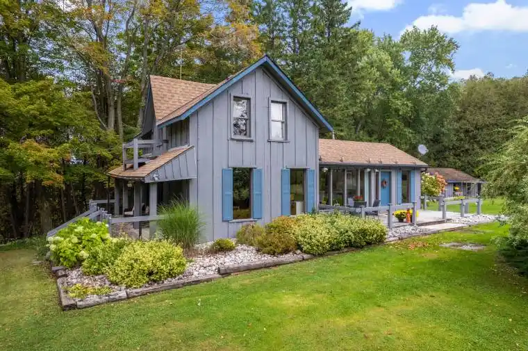 This 1890 century home sits on 23.1 acres with Bell Creek running through the property, offering a rare combination of heritage charm, privacy, and modern updates. Lovingly maintained over the years, its ready for those seeking a well-balanced country lifestyle just minutes from town. The property includes approx. 2 acres of lawn and gardens with raised flower beds, mature trees, and walking trails. Two decks overlook the gardens and woodland, providing a quiet place to relax with the sound of the creek in the background. Inside, the bright, eat-in country kitchen features an oversized island, generous windows, a fireplace and a walkout to the deck. A cozy living room and a compact office area complete the main floor. Upstairs you’ll find two well-proportioned bedrooms and the lower level is clean and dry, offering a laundry area, utility room, and workbench. The detached two-car garage provides ample storage and workspace, including a heated area suitable for hobbies or small animals. Practicality extends beyond the home itself. This private setting is on a paved road and just 3 km from Durham, where you’ll find shopping, schools, medical care, and recreation facilities. Four-season activities are all nearby – swimming, paddling, fishing, skiing, snowmobiling, and golf – making this an excellent base for both work and leisure. With creek frontage, usable acreage, and proximity to essential amenities, this property offers the convenience of small-town living paired with the space and privacy of a country retreat.