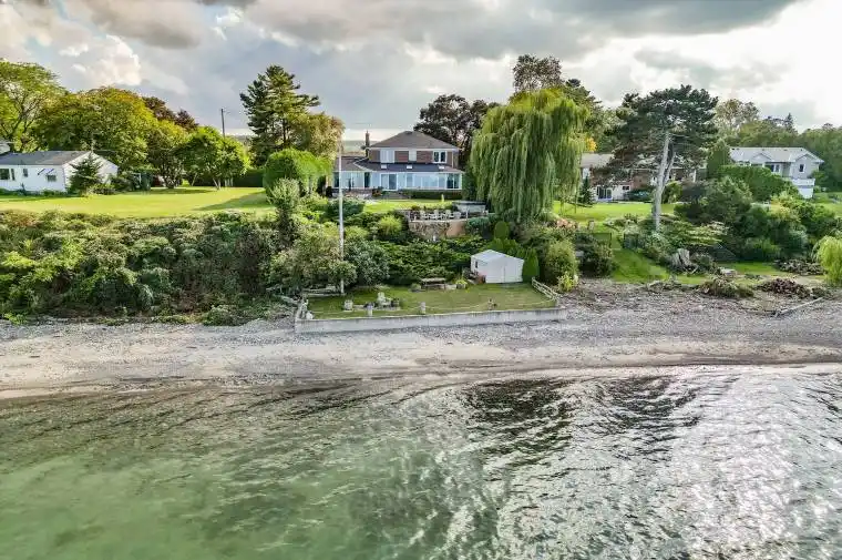 GRIMSBY BEACHFRONT WITH REMARKABLE LAKE ONTARIO AND GTA SKYLINE VIEWS Welcome to an exceptional private beachfront home in Grimsby, where postcard-perfect Lake Ontario and GTA skyline views are a daily reality. The traditional center hall plan leads you into an elegant living room, complete with a cozy gas fireplace and unobstructed water views. The spacious kitchen features an abundance of cabinetry, while the breathtaking 500 sq ft, four-season sunroom serves as the home’s centerpiece, offering wall-to-wall windows and ever-changing vistas.Upstairs, the primary bedroom suite is a private sanctuary with a walk-in closet and a three-piece ensuite, which features a custom glass shower and stunning views. Two additional, generous bedrooms and a four-piece bathroom complete the upper level. Downstairs, the finished basement provides a custom wine cellar, a large recreation/media room, and a built-in wet sauna with a two-piece bathroom. The true masterpiece is the meticulously landscaped backyard, which offers multiple entertaining areas, including a patio, a hot tub, and your own private beachperfect for swimming, kayaking, or paddleboarding.This lakeside retreat also includes a single-car garage, double-wide parking for four cars, and easy access to the QEW, YMCA, and multiple schools. Come experience picturesque sunsets and a remarkable waterfront lifestyle.
