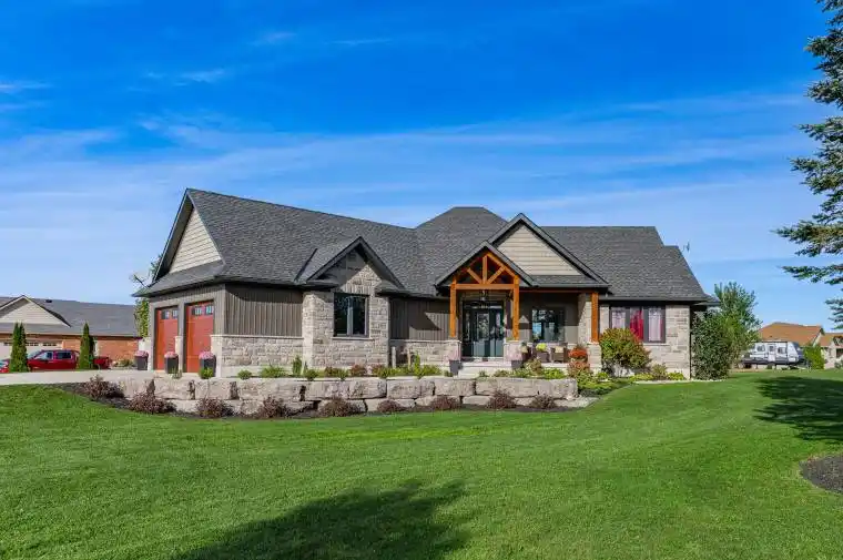 Rustic Lodge Charm Meets Modern Living. Welcome to this striking custom-built bungalow, perfectly set on a 1.15-acre corner lot in the coveted Marshall Heights subdivision where peaceful country living meets community convenience. Timber beams frame the inviting front porch and open to a generous foyer, introducing a layout designed for both everyday living and effortless entertaining. At the heart of the home, the great room takes centre stage with its spectacular stone fireplace, perfect for cozy evenings by the fire. The kitchen is a showpiece, featuring an oversized island, finely crafted cabinetry, and thoughtful details that make both casual family meals and festive gatherings a delight. Host holiday dinners in the formal dining room or extend the party outdoors on the deck, complete with a partially covered entertaining space ideal for dining, relaxing, or watching the big game. The private primary suite, tucked into its own wing, offers a walk-in closet, spa-like ensuite, and direct deck access. Two additional bedrooms and a full bathroom are located in the opposite wing, ensuring comfort and privacy for family or guests. Practical features abound, including a powder room, main floor laundry, and an oversized double garage with inside entry. The fully finished lower level expands your lifestyle options with two more large bedrooms, a family room, a flexible gym/office space, a full bathroom, ample storage, and a cold cellar. Outdoors, the expansive yard is full of possibilities. With a large shed, RV/boat parking, and plenty of space for a pool or future workshop, its ready for all your hobbies and dreams. Perfectly situated between Durham and Mount Forest, this home offers year-round recreational opportunities-hiking, ATVing, skiing, snowmobiling, and more, all just minutes away. This isn’t just a home it’s the lifestyle you’ve been dreaming of.