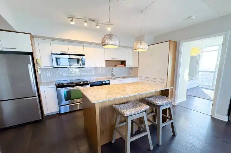 Luxurious 2-bedroom, l-bathroom corner suite with stunning floor-to-ceiling windows offering unobstructed panoramic views. This bright and spacious unit features a thoughtfully designed open-concept layout with split bedrooms for added privacy. The modern kitchen boasts sleek granite countertops, stainless steel appliances, a built-in pantry, and ample storage space. The living and dining area flow seamlessly, creating an inviting atmosphere perfect for entertaining. Step out onto the private balcony to enjoy breathtaking cityscapes. Additional features include ensuite laundry, one underground parking space, and a secure locker for extra convenience. Residents enjoy access to state-of-the-art amenities, including an indoor pool, sauna, fully equipped gym, and much more. Conveniently located with easy access to major highways, downtown Toronto, schools, parks, Sherway Gardens, the Airport, Kipling Subway Station, and GO Transit. Experience modern living at its finest!