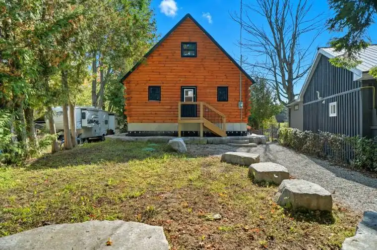 Discover the Ultimate in Waterfront living with this Rare Log home, a style prized for its Soaring Ceilings, Striking Angular roofline, and unparalleled architectural character properties like this are extremely scarce on the market. Every detail has been Thoughtfully designed to maximize Natural light, comfort, and riverfront views.The property features impressive Armour stone landscaping, a highly skilled and labor-intensive construction choice that enhances both aesthetics and shoreline durability, culminating in a stunning large dock for water access and Enjoyment.Inside, the Open-concept chalet-style interior boasts huge windows, a lofted master bedroom overlooking the main living area, and 2 additional bedrooms on the main level. The modern kitchen is outfitted with Stainless Steel Appliances, complemented by a convenient laundry area and a 4-piece bathroom.Outdoor living is effortless, with ample parking in the Front, a spacious Back yard perfect for entertaining, a covered cabana, and a fire pit. Modern comforts include a propane Furnace, AC, owned water heater, and Starlink High-speed internet.The home also includes a new Elgen Septic system,reducing maintenance requirements and heated water line with UV filtration, allowing Year round access. Only thing left is to move in and Enjoy your waterfront paradise. This is more than a home! It is a rare architectural gem on the Burnt River that combines luxury, craftsmanship, and serenity in one unmatched package. Opportunities like this do not come often. Act Fast!