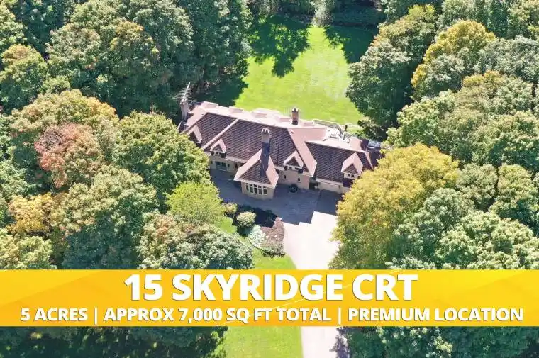 15 Skyridge Crt Offering 5 Acres | Approximately 7,000 Sq Ft Total | Mature Forest | Stream | & a Premium Location. Just Minutes from Highway 404, Top-Rated Schools, the Bloomington GO Station, Golf Courses, and the Amenities of Aurora, Markham, and Richmond Hill. The Property offers a Canopy of Mature Maple Hardwood Forest with Trails and Rolling Topography. Nestled on a Private Cul-de-sac of just 11 Executive Homes. Inside, a Grand Foyer Opens to a Formal Living Room with a Cozy Fireplace and Serene Views. The Private Library offers Built-in Shelving and a Peaceful Retreat. The Gourmet Kitchen Features Granite Counters, a Spacious eat-in Area, Forest Views, and a Walk-out to the Elevated Deck. The Dining Room Impresses with Soaring Double Height Ceilings and a Striking Stone Fireplace. Upstairs, the Primary Wing offers a Fireplace, Dual Ensuites, and Custom Closets. A Private Guest Suite above the Garage Includes its own 3-piece Ensuite – Perfect for In-laws/Nanny. The Newly Renovated Lower Level offers Full-size Windows, Multiple walk-outs, a Custom Media Room with Stone Fireplace, and an Open-Concept Entertainment Space with Bar and Dining Areas (Potential for additional Lower-Level Kitchen and suite with Approvals). A Spa-Inspired 3-piece bath Completes this Level. Outside, explore over 215,000 sq. ft. of Natural Beauty – a Premium Location offering a place to Breathe, Connect, and Create lasting memories.