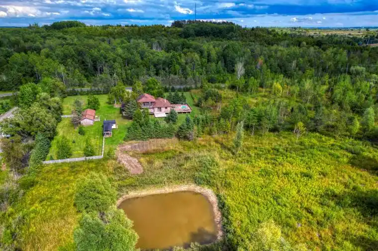 Whether your dream is to settle into a forever home, create a thriving Airbnb, or host unforgettable retreats, this one-of-a-kind property offers more than just a home-it’s a lifestyle experience only an hour from Downtown Toronto! This fully renovated country retreat combines luxury and functionality on nearly 10 acres of private land. Over $$$ invested in upgrades and renovations over the past three years and have transformed it into a true showcase of modern rural living. The home features 5 bedrooms and 4+1 bathrooms, including two primary suites-one on each floor-making the main level convenient with 2 bedrooms and 2 bathrooms, and the remaining bedrooms upstairs. The spacious living room impresses with cathedral ceilings, large picturesque windows, refinished parquet floors, and a wood-burning fireplace with a custom sunken seating area made from reclaimed barn beams. Additional highlights include a bright kitchen and dining room with direct access to the patio, a main-floor primary suite with a 4-pc ensuite, Jacuzzi, and sunroom with panoramic views, plus a second primary suite with a balcony, wet bar, and 3-pc ensuite. Outdoor features include a large deck with a 12-ft year-round hot tub, private pond, fire pit, and a nearly 400-sqft detached finished studio ideal for office, art, or wellness use. More to explore: a vegetable garden, storage shed, and a fancy custom chicken coop that perfectly complements the property’s countryside charm. Located on a quiet cul-de-sac just minutes from Lake Simcoe, Sibbald Point Park, and Jackson’s Point,schools, library, restaurants, grocery stores, and golf courses.This property offers the perfect balance of comfort, privacy, and rural elegance.