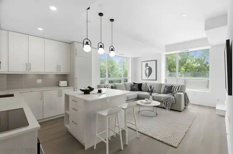 Welcome to Suite 247 at King Terraces a rare offering that blends luxury, light, and lifestyle. This southeast-facing corner suite boasts a generous 963 sq. ft. of refined interior space and a sprawling 192 sq. ft. private terrace, perfect for effortless indoor-outdoor living. Designed with distinction, this 2-bedroom, 2-bathroom suite features a split-bedroom layout for optimal privacy, soaring 9-foot ceilings, and vinyl flooring throughout. Natural light pours in through oversized windows, creating a warm and sophisticated ambiance in every room. The modern chef’s kitchen is equipped with integrated appliances, sleek quartz countertops, and contemporary cabinetry ideal for entertaining or quiet evenings at home. The open-concept living and dining areas seamlessly extend to the terrace, offering a serene escape with southeast exposure. The primary bedroom is generously sized and complemented by a spa-inspired ensuite with a walk-in glass shower, while the second bedroom offers its own quiet comfort with access to a nearby full bath. Additional features include EV parking, a storage locker, and high-speed internet, all included for your convenience. As a resident of King Terraces, you’ll enjoy exclusive access to 5-star amenities, including a state-of-the-art fitness centre, rooftop terrace, resort-style outdoor pool, elegant party lounge, and 24-hour concierge service all thoughtfully designed to elevate your everyday living. Ideally located near fine dining, boutique shopping, parks, and major transit, Suite 247 delivers a lifestyle of understated elegance and unmatched convenience.