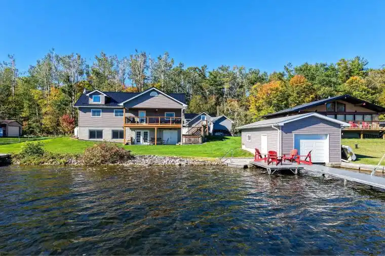 Welcome to this stunning Lower Buckhorn Lake home with a wet slip boat house and three-bay garage. This 3-bedroom, 2-bathroom home completely renovated in 2008 and has been continuously improved since, it combines modern comfort with the serenity of lakeside living. The heart of the home is the 2021 custom kitchen, featuring cathedral ceilings, granite countertops, and updated appliances. Its spacious, open design flows seamlessly onto a large covered balcony overlooking Deer Bay. The main floor includes a large bedroom with four windows and a cathedral ceiling. Also on the main floor is laundry facilities (2021), and a versatile second bedroom/office. The finished basement provides additional living space with a cozy wood-burning fireplace, the third bedroom, and a walk-out to a private patio with easy water access. This home is truly turnkey, with all major systems and features already taken care of. Renovations as follows: In 2008 a Complete home update. In 2021 a New custom kitchen (cabinets, granite countertops, appliances). In 2021 a New Furnace & central air. In 2023 a New three-bay garage with insulated loft space (permit closed). In 2024 a Septic system (permit closed). In 2024 a Metal roof on main house. For those who love the water, this property includes a boat house, docks with a 4 foot depth that goes down to 20 feet – perfect for swimming, boating, and excellent fishing. This property has calm waters, minimal boat traffic, welcoming neighbours, with hiking trails on the other side of the road. This home offers the perfect balance of modern upgrades, spacious living, and a waterfront lifestyle just 20 minutes from downtown Peterborough and 1.5 hours from Toronto.