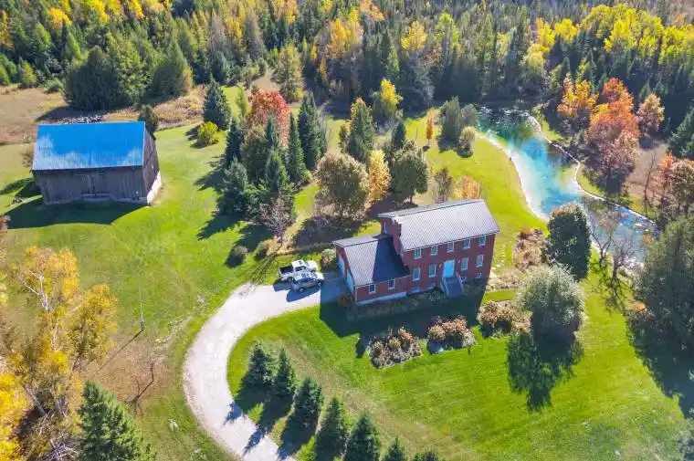This is one of the most beautiful, picturesque, private properties we have ever listed, please come and take a look! 100 acres of scenic tranquility and pure privacy, offers managed forest with many walking trails, spring fed stream and artesian well. Enjoy stunning views over the large spring fed pond which provideds entertainment year-round. This solid custom brick home with metal roof was built with quality in mind. Main level open concept is ideal for entertaining. Every window offers wonderful views. Some interior features are; central oak staircase, solid oak flooring thoroughout, custom bevelled oak trim and baseboards throughout, custom oak kitchen with features; 9′ main level ceilings & 7’11” ceiling on upper level; 4 generous bedrooms with large closests; family room is adjacent to the mud room with 3-piece ensuite. Rec room is partially finished around a wood stove and offers a walkout, bathroom, laundry and utility room. Note: the heating system is a ground source system, offers heating and cooling throughout the year, water heating and is backed by a generator. A 34 x 54 ft. bank barn offers many possibilities and a drive shed for equipment storage. The 3 garage measures 30’8″ with 2 single doors.