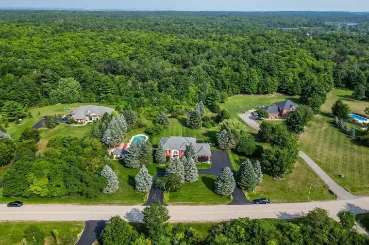 Welcome to 8 Deer Run an exceptional property in a sought-after executive estate subdivision. This private retreat sits on nearly 4 acres, including 1 acre of protected conservation. This beautifully maintained home offers approx. 3,100 sq ft above grade plus a walkout basement, combining timeless charm with modern upgrades. Perfect commuter location centrally located just minutes to Guelph, Milton, and Acton. The main floor features 9-ft ceilings, original hardwood, pot lights, crown moulding, a double-sided fireplace, and French doors opening to a coffered living room. The spacious eat-in kitchen includes granite countertops, travertine backsplash, built-in oven and cooktop, freezer, breakfast bar, walk-in pantry, and walkout to a 4-year-old deck with gas hookup and awning. A mudroom with laundry and deck access complements the 3-car garage. Upstairs offers 4 generous bedrooms, oak staircase with runner, pot lights, and original strip hardwood. The primary suite features double-door entry, fireplace, large walk-in closet, and 6-pc ensuite with Jacuzzi tub, walk-in shower, linen storage, and new toilet. Updated 4-pc main bathroom and additional linen closet complete the level. The finished walkout basement with separate entrance to the in-law suite offers 9-ft ceilings, pot lights, above-grade windows, a 3-sided fireplace, wet bar, cold room, and bedroom with stove connection and huge walk-in closet (or use as second bedroom) plus 3-pc ensuite and laminate flooring. The fenced-in 7-ft deep pool is thermal heated with a 2-year-old pump and filter. Enjoy a fully equipped pool house with running water and electricity, interlock walkway, perennial landscaping, sprinkler system, electric dog fence, surround sound, and outdoor fridge/freezer. Roof on house and pool house replaced 4 years ago with new gutters and guards. A true oasis with incredible privacy, just minutes to amenities