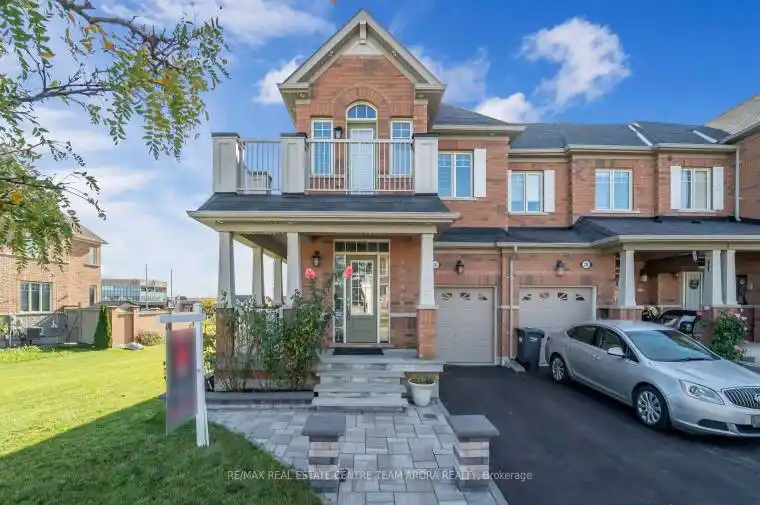Beautifully upgraded end-unit freehold townhouse on a 32.9 x 100 ft lot. The main floor offers an open-concept layout with hardwood floors, bright living and dining areas, an upgraded kitchen with quartz countertops, and pot lights throughout. Upstairs features three bedrooms, including a primary with an upgraded ensuite and walk-in closet, laminate flooring, upper-level laundry, and access to a balcony. The exterior boasts a wraparound ground-level porch, professional interlock and landscaping, and a large backyard, all adding to the home’s curb appeal. Ideally located close to schools, parks, shopping, transit, and major highways.