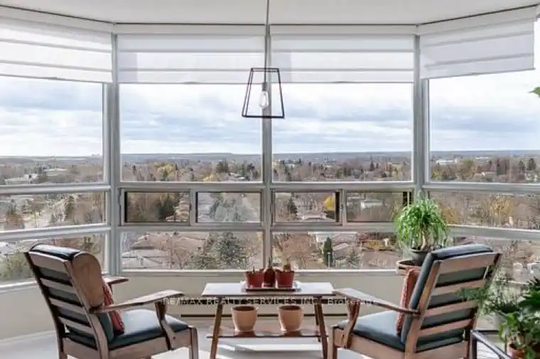 A beautifully upgraded CORNER suite in a great location. Huge windows in all the rooms allow for breathtaking 180 degree panoramic views. Stunning sunsets and on clear days you can even see the Escarpment. Open concept Living, Dining and sitting room (solarium doors have been removed). Kitchen made for a chef! Sub Zero fridge, Wolf stove top, Smeg oven, Miele Dishwasher and a brand new Zephyr Wine and beverage cooler. Lots of cupboard and counter space, a handy pass thru and cozy breakfast nook complete this space. Ensite laundry with Miele washer and dryer. Primary bedroom with a large walk in closet. Three piece ensuite with lock off shower and toilet. Second bedroom or office can be accessed rom the hall or sitting area. Limestone flooring has recently been professionally detailed. Located steps to public transit, walk or bike along the Etobicoke creek for miles, stores nearby.
