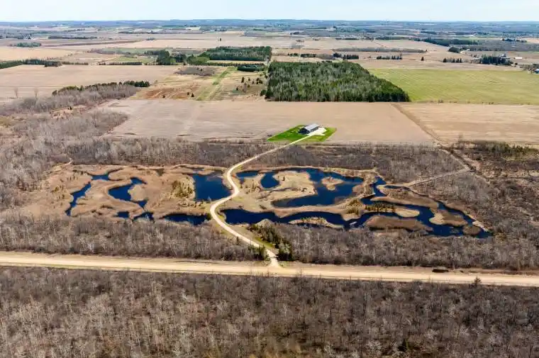 If the privacy & adventure of country living has been a dream of yours, this home, the property, the ponds, the forest trails and the surrounding areas will be your dream come true! This home offers so many incredible & unique opportunities for your family! Enjoy perfect privacy on this 96 acre property with 40 acres of tile drained farm land. As you drive down the beautiful winding driveway, you are welcomed home by several ponds and enchanting natural landscapes on either side. Custom built in 2010, the 2 family home perfectly suits its natural surroundings with a board & batten exterior, metal roof, wood trim finishes throughout the inside and a wood stove on both floors. The main floor unit features 3 large bedrooms, and an open concept space including large modern kitchen, dining room w/ walkout to the property & family room w/ cozy wood stove. Upstairs is your own private gym & the 2nd living unit, which includes gorgeous views of the property through so many windows, log walls, hardwood floors, beautiful custom kitchen with wet island & dual oven, open concept dining & family room & cozy raised bedroom. Potential income opportunities through: 1) the massive attached workshop 2) 40 acres of tile drained farm land 3) rental of the upstairs or main floor unit. So much to love! Come see for yourself.