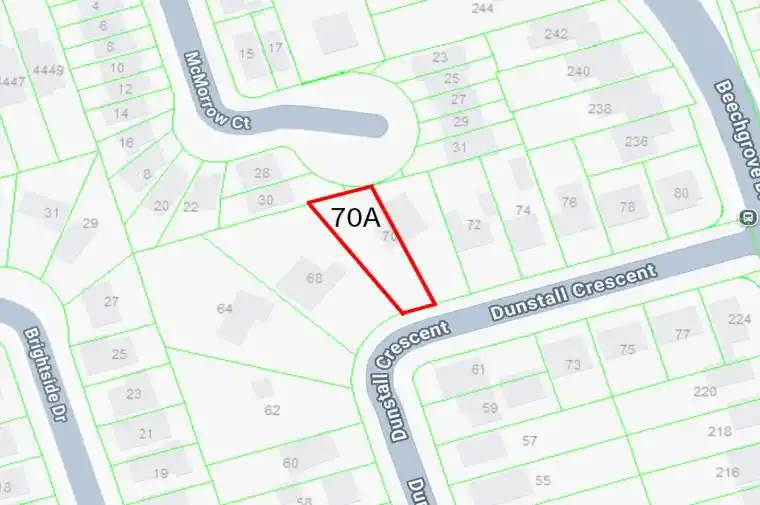 Most competitively priced building lot in Toronto. Land parcel now fully registered with its own separate PIN. Located in West Hill, an area characterized by mature streets and ongoing custom home development, with a mix of established residences and newer builds. 8,116 sq. ft. pie-shaped lot with approximately 44′ of frontage at the setback line, widening to 66′ at the rear, allowing for a functional building footprint. TLAB approved for approx. 4,085 sq. ft. above grade (plans in attachments). Multiplex design possible. Features a large front yard setback for on-site parking, with potential for rear street parking access. Neighbouring parcel 70B Dunstall also available for sale, offering the option to acquire side-by-side lots. Minutes to Rouge Hill GO Station, 401 & Kingston Rd. Close to University of Toronto Scarborough Campus (4km),Centennial College (4km), Centenary Hospital (5km), Pan Am Centre (4km), Rouge Valley trails, and Lake Ontario. Existing house sits on both 70A and &70B Dunstall and is being sold in its current state with no warranties or representations. Taxes not yet assessed.