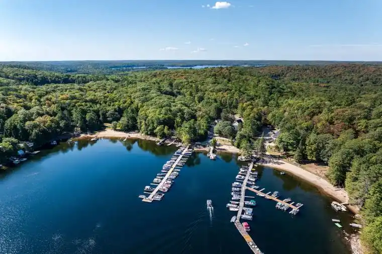 Welcome to Oakview Lodge, a rare waterfront estate on the shores of Little Hawk Lake in the heart of Algonquin Highlands. Thoughtfully updated while retaining its historic charm, this exceptional property offers a unique opportunity to create a private family compound, legacy retreat, or luxury cottage destination – with the added benefit of income potential. The main lodge offers over 8,500 square feet across 4 levels, blending classic lodge character with modern comfort. A wrap-around veranda welcomes you with sweeping lake views, while inside, the main level features expansive sitting, dining, & living areas anchored by a striking stone fireplace. A spacious chef’s kitchen designed for large gatherings includes a walk-in pantry/laundry & opens to a screened BBQ porch, seamlessly connecting to a landscaped & private backyard with a central fire pit. The second floor features 6 updated bedroom suites, each with its own ensuite, providing comfortable accommodations for family & guests, along with access to a shared deck overlooking the lake. The third floor is dedicated to a fully self-contained 3-bedroom owner’s retreat, showcasing exceptional craftsmanship, an open-concept kitchen & living area, in-suite laundry, a private balcony, & stunning lake views. The property also includes a charming 2-bedroom year-round guest cottage & an oversized 2-car garage with a loft currently used as a seasonal art studio, offering excellent flexibility for guests or creative use. Set on the pristine shoreline of Little Hawk Lake, Oakview Lodge includes established dockage & marina facilities, providing effortless access to the water & a opportunity for supplemental income. Surrounded by natural beauty and close to excellent hiking trails, this remarkable property offers privacy, recreation, & refined lakeside living. Whether envisioned as a multi-generational estate, private retreat, or legacy property, Oakview Lodge is truly one-of-a-kind.