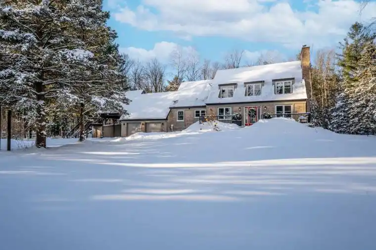 THE PROPERTY THAT TURNS “WHAT IF” INTO “THIS IS IT!” This is the listing that makes every other tab on your browser look boring. Settled on 2 private acres wrapped in mature trees, this home finally gives everyone breathing room, with a walkout basement offering real in-law potential and a loft teens will claim long before they have earned the rent they think they are paying. The brick exterior, dormer windows, long driveway, and landscaping set the tone, leading to a layout filled with warmth and personality. The kitchen could live on Pinterest with wood and white cabinets, a subway tile backsplash, high end appliances including a side-by-side fridge and freezer, and more cabinetry than you will ever run out of, which means your next Homesense run will be less about storage solutions and more about how you want to style your new favourite space. The living room brings charm with French doors and a fireplace, while the family room adds character through exposed beams, another fireplace, and a walkout to a fenced yard with a flagstone patio overlooking the pond and trees. A sunroom wraps you in peaceful views and the main-floor office gives you the quiet zone everyone needs. The second level unfolds into a sitting area that feels made for slow mornings or late-night talks, leading to a primary retreat with an ensuite and additional bedrooms that offer comfortable places to recharge at the end of the day. The walkout basement opens up endless flexibility with a kitchen, rec room, bedroom, den, gym, and bathroom that make multi-gen living feel simple. The loft above the garage elevates the setup with vaulted ceilings, skylights, exposed beams, a private deck, and its own staircase to the yard, ideal for a creative zone, or that friend who always stays longer than planned. Geothermal heating, a triple-wide driveway, an insulated 2 car garage, and a water softener complete a property that delivers the kind of life people mean when they say they want “more.”