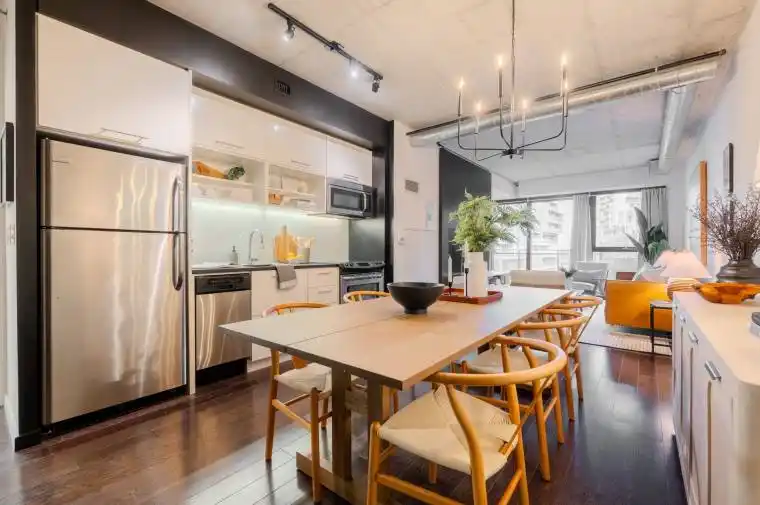 A thoughtfully designed loft-style residence that delivers exceptional flexibility, natural flow, and a lifestyle-forward setting in the heart of the Canary District. This open-concept one-bedroom plus den offers a rare level of versatility, with a generously sized den that comfortably functions as a true second bedroom. A collapsible wall allows the space to open seamlessly for entertaining or close off for privacy, work-from-home needs, or guests. Concrete ceilings and warm hardwood floors create a modern, architectural backdrop, while the kitchen integrates effortlessly with the living and dining areas for everyday ease and hosting alike. Storage is both abundant and intentionally planned, highlighted by an oversized walk-in closet located in the front hall, making it ideal as additional storage for a second bedroom or den setup. The semi-ensuite, dual-access bathroom is complemented by extended cabinetry and linen storage above a brand new washer/dryer combo (2025) for added functionality. Step outside to an open balcony overlooking the landscaped courtyard and outdoor pool, offering a resort-like atmosphere that truly shines in the warmer months. Surrounded by some of downtown Toronto’s most thoughtfully planned green space, including the expansive Corktown Commons just steps away, perfect for morning walks, sunset runs, or relaxed afternoons outdoors. Enjoy downtown living without the chaos, while in close proximity to the Distillery District, St. Lawrence Market, Riverside, and Leslieville, with easy TTC access to King and Queen streetcars and seamless connectivity to the DVP, Lakeshore, and Bayview Extension. Everyday conveniences abound, from parks and trails to fitness centres, grocery options, dog-friendly cafes, and standout dining destinations such as The Broadview Hotel rooftop. A well-managed building with 24/7 security and impeccably maintained common areas completes the offering – a refined, flexible home designed for modern urban living.