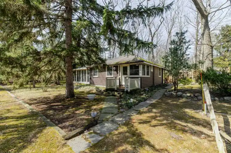 Nestled just steps away from the serene shores of Lake Huron, this charming and unique cottage offers the perfect escape from the hustle and bustle of everyday life. Surrounded by lush, towering trees, the cabin exudes rustic warmth and tranquility, making it an ideal destination for those seeking a peaceful getaway.The cabins natural wood exterior blends seamlessly with its forested surroundings, providing both privacy and a stunning backdrop. Inside, the cabin boasts a cozy, inviting atmosphere with a gas fireplace, and large windows that allow you to enjoy views of the trees and hear the nearby lake. Many updates throughout that help maintain the original integrity of the cottage including, hardwood floors, replacement windows, 100 amp service, fully winterized throughout and a fabulous sunroom with soaring ceilings and stone floors. A gas bbq and hot tub compliment the patio with ample areas to entertain, relax and enjoy. Whether you are curling up with a good book in front of the fire, or sipping your morning coffee on the deck as the sun rises over the trees, the cabin offers the perfect setting for relaxation.What makes this cabin even more special is its proximity to Lake Huron. Just a short walk away, you can enjoy the pristine beach, take a swim in the refreshing waters, or spend your days kayaking, paddleboarding, or simply soaking in the natural beauty. Additionally, the cabin is within walking distance to the vibrant town of Grand Bend, where you can explore local shops, restaurants, and enjoy the lively atmosphere of one of Ontarios most beloved beach destinations.Whether you’re seeking adventure on the water or quiet moments in nature, this log cabin offers an unforgettable retreat with a perfect blend of rustic charm and modern comfort.
