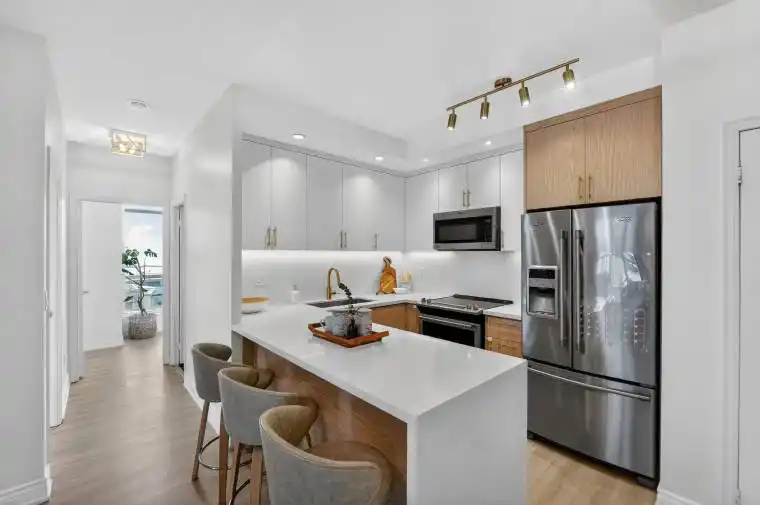 Beautifully renovated 2-bedroom + den, 2-bathroom corner suite offering over 1,000 sq. ft. of bright, well-designed living space with unobstructed south-east views of Lake Ontario, abundant natural light through expansive floor-to-ceiling windows, and three walkouts to private balconies-a rare combination of space, panoramic views, modern upgrades, and outdoor access in a quiet, well-managed community. Renovated in 2023, the home features a contemporary chef’s kitchen with a waterfall quartz peninsula, full-height quartz backsplash, soft-close cabinetry with integrated storage, and stainless steel appliances, complemented by wide-plank oak flooring, fresh paint (2025), and meticulous upkeep throughout. The versatile den is ideal for a home office or nursery, while the split 2-bedroom layout offers excellent privacy and flexibility for families, professionals, or downsizers. Ideally located steps to Ontario Place, Exhibition Place, Billy Bishop Toronto City Airport (with a unique vantage point to watch planes arrive and depart), waterfront trails, parks, TTC, grocery stores, cafés, restaurants, with easy access to Union Station and the Gardiner. Includes 1 parking and 1 locker.