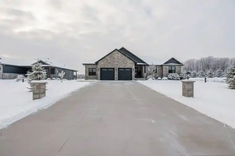 Custom-built bungalow. Over 4,000 finished sq ft. Heated floors in the lower level. Quartz kitchen with butler’s pantry. Stone exterior. If you’ve been waiting for space without sacrificing style, this Nickason Drive home delivers in every way Ideal for families who want room to live, work, entertain, and grow. Set in Allenford’s sought-after Nickason Drive subdivision, it blends a peaceful country feel with unbeatable central convenience. Just 15 mins to Southampton, 20 to Owen Sound & Port Elgin, 40 to Bruce Power. Curb appeal stands out with full Shouldice stone exterior, stamped concrete porch, triple-wide driveway, modern entry and oversized 2.5-car garage. Inside, the open-concept layout is refined and functional. The kitchen is a showpiece with quartz counters, contrasting white and white oak cabinetry, brick-style backsplash, black stainless appliances and farmhouse sink overlooking the yard. A walk-in butler’s pantry adds bonus storage and prep space, with a stylish 2-pc bath tucked nearby. The living room features a propane fireplace with stone surround, custom built-ins and glass doors to the backyard. The primary suite offers a spa style ensuite and walk-in closet with laundry nearby. Two additional bedrooms share a beautifully finished 4-pc bath. The fully finished lower level impresses with 9-ft ceilings, in-floor heat, custom media wall and space for a golf simulator, gym or play zone, plus a 4th bedroom, office/guest room and designer 3-pc bath. Outside, relax on the covered 16′ x 8′ patio or soak in the hot tub under the gazebo. The fenced yard backs on to open space for privacy and peaceful views. A rare, best-of-the-best offering – homes like this don’t come along often.