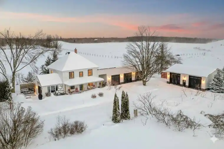 Set on approximately 1.2 private acres and tucked away on a quiet dead-end road behind Mt. St. Louis Moonstone Ski Hill, this renovated century home offers exceptional privacy, space, and a true four-season lifestyle. The home is set well back from the road, surrounded by mature trees and landscaped grounds, with direct ski hill access from the yard (with ski pass). The farmhouse-inspired exterior features a metal roof, updated siding, and a covered front porch with composite decking and pot lights. Inside, the bright main floor showcases hardwood floors, a wood-burning fireplace, a dedicated office, and a renovated powder room(2024). Large windows and walkouts create seamless indoor-outdoor living. The renovated chef’s kitchen (2024) features heated floors, a large island, stainless steel appliances, a farmhouse sink, a shiplap ceiling, updated lighting, and pantry space with a wine fridge, plus a walkout to the hot tub area. Upstairs offers three bedrooms, including a spacious primary suite with a walk-in closet, and a renovated 4-piece bathroom with walk-in shower and clawfoot tub. Original hardwood floors continue throughout. The finished basement adds valuable living space with a rec room, laundry area, storage, and a 2-piece bathroom with additional plumbing in place for a future shower. A major highlight is the 5-car total garage/shop space, featuring an attached 29′ x 60′ heated and finished three-car garage (built 2023) with interior access, plus a detached 30′ x 40′ heated two-car garage/shop (built 2021). Other extensive updates include: shingled roof June (2025), metal roofs (2021), new exterior (2023), new windows (2023), new doors (2024), new deck (2023), 400-amp service (2021), new house panel (2023), woodshed (2024), and full interior repainting over the past five years. Surrounded by hiking, ATV, and biking trails, this unique property offers privacy, recreation, and convenience just minutes to highway access.