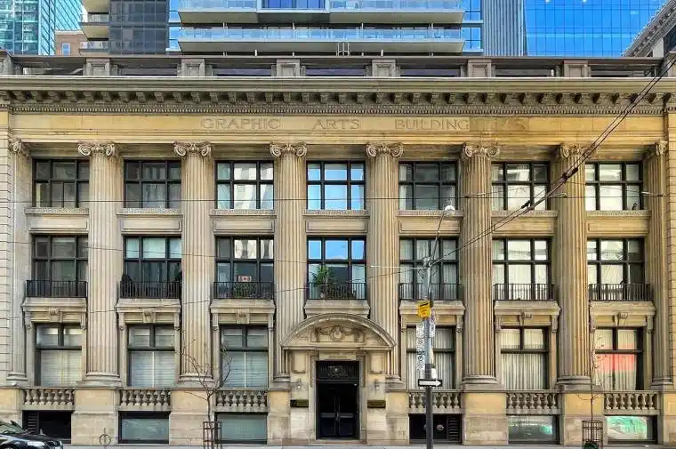 Location, location, location! Welcome to the iconic Graphic Arts Building-a rare, heritage boutique building in the heart of Toronto’s Financial District. Originally built in 1923 and converted to condos in 2003, this five-storey architectural gem features a striking limestone façade and Roman-inspired Ionic colonnade. Once home to Saturday Night magazine, the building now offers just 64 unique live/work residences.This furnished 1-bedroom suite showcases soaring ceilings, hardwood floors, and a bright open-concept layout. Enjoy a full-size kitchen with ample cabinetry and marble countertops, plus the convenience of ensuite laundry.Steps to cafés, world-class restaurants, and shopping (including the Eaton Centre). Unbeatable transit access-subway and street-level connections-plus quick reach to the waterfront, theatres, museums, and cultural hubs. Walk to Scotiabank Arena, hospitals, Nathan Phillips Square, and everything downtown has to offer. Walk Score & Transit Score: 100.Extras: Furniture, wall art, window blinds, light fixtures, stainless steel appliances (fridge, stove, built-in microwave/exhaust, built-in dishwasher), washer & dryer, sprinkler system.