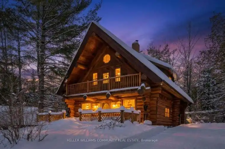 Situated in the village of Burnt River, while still being tucked away from the everyday, this 2.5-storey Scandinavian-style log home feels like stepping into your own private world – quiet, natural, and the perfect mix of manicured landscaping and untouched forest. With 1.5 acres of open yard space and the rest of your 27 acres being forested trails, it’s a haven for nature lovers, gardeners, and anyone craving room to grow and explore, or just breathe. Inside, a floor-to-ceiling stone fireplace anchors the kitchen and living area with instant warmth and rustic charm. The main floor also includes a flexible bedroom/office, a 3-piece bath, and a bright 3-season sunroom that feels like a fairy tale whether it’s raining or the sunniest day on earth! From here you can head outside and down enchanting stone steps into your own greenery sanctuary. Upstairs offers three bedrooms, including a spacious primary with a bonus room currently used as an incredible walk-in closet, easily repurposed as an office or private retreat. Another full bathroom completes this level. The third-floor loft adds a playful touch, ideal for reading, relaxing, or a kids’ hideaway. The finished walkout basement expands your living space and features a wood stove, which is a pleasant touch on those colder days. Outside, you’ll find a triple-car garage (with 100amp service) with 1,000 sq. ft. of finished loft space above for guests, work, or hobbies, plus an 8×2 garden shed and an 10×24 drive shed for your tractor and toys. This is more than a home, it’s a lifestyle. Mornings with birdsong, afternoons on wooded trails, evenings by the fire. Rustic charm and modern comfort meet here. Conveniently located near small-town essentials: Kinmount (14 minutes), Fenelon Falls (15 minutes), Bobcaygeon and Minden (~30 minutes), and direct access to the Victoria Rail Trail (ATV/snowmobile trails) a boat launch at the end of Hillside drive, and close proximity to Four Mile Lake and Crystal Lake.