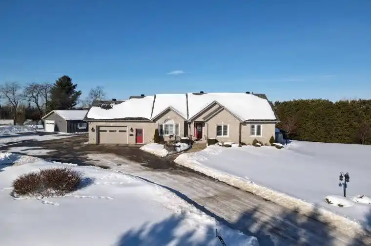 A rare blend of quality, style and thoughtful design make this spacious bungalow a stand out! From 200 amp service, full insulated concrete form construction & in-floor radiant heating on both levels (including the garage) to cathedral ceilings & oversized windows that flood the space with natural light this home has it all. The main floor boasts a dream kitchen which features: marble counter tops, SS apron sink and coordinating SS appliances (double oven electric smooth top range, 5 door fridge, double door BLUESTAR wall oven), pot-filler, a separate 6′ x 3′ baker’s peninsula with its own sink, cabinet mixer lift & bar seating and a walk-through Butler’s Pantry between the kitchen and sunroom ideal for hosting or everyday living. Get cozy by the gas fireplace sitting area, enjoy a meal at the dining table or access the back deck from the grand sunroom, perfect for entertaining or unwinding while enjoying the view. The primary suite enjoys cathedral ceilings, walk-in closet, spacious en-suite with 2 sinks, fireplace, walk-in luxury glass shower & separate water closet. Two more bedrooms, (segregated from the primary), full bathroom, laundry room, office nook & eating area complete the main level. Direct access from the garage to the basement offers serious versatility with its radiant floor heating, large windows, family room, huge lounge/games area with custom built-in rosewood cabinetry wall & extensive wet bar (including dishwasher, wine fridge, beer tap and more), a den, full bathroom & plenty of storage. This sprawling 1+ acre country setting is just minutes from charming Perth with its rich history, vibrant art scene & beautiful natural setting along the Tay River. The hedged, private, yard offers: cherry & apple trees, 2 gazebos, an attached, oversized, heated garage, detached double garage with workshop and abundant paved parking. Whether you are looking for extra guest space, a home office setup, or a potential in-law suite, the possibilities are endless.
