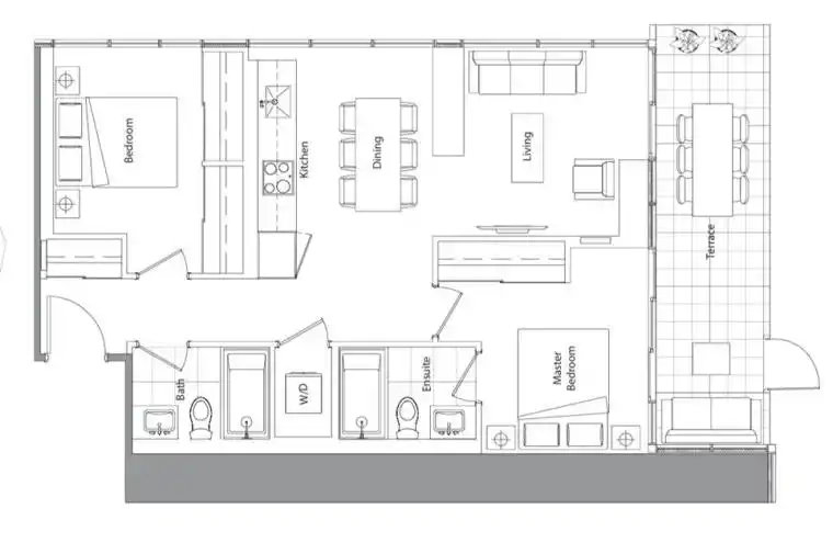 Garden Suite on the amenity level with only two residences on the floor! Rare southeast corner layout offering approx. 840 sq ft plus a ~152 sq ft heated terrace with direct walk-out access to the outdoor amenity deck. Bright open concept with smooth ceilings and floor-to-ceiling windows. Two walkouts to the terrace from the living room and primary bedroom. Flexible living area can accommodate a pull-out sofa for guests. Lake views, integrated security system & sensors, modern finishes, and concierge service. Unmatched convenience – step directly to BBQ areas, seasonal skating rink, pool and wellness facilities. Minutes to CN Tower, Rogers Centre, Scotiabank Arena, Union Station, dining, shopping & entertainment. Locker included. Parking available at additional cost. A truly unique offering not repeated on other floors.